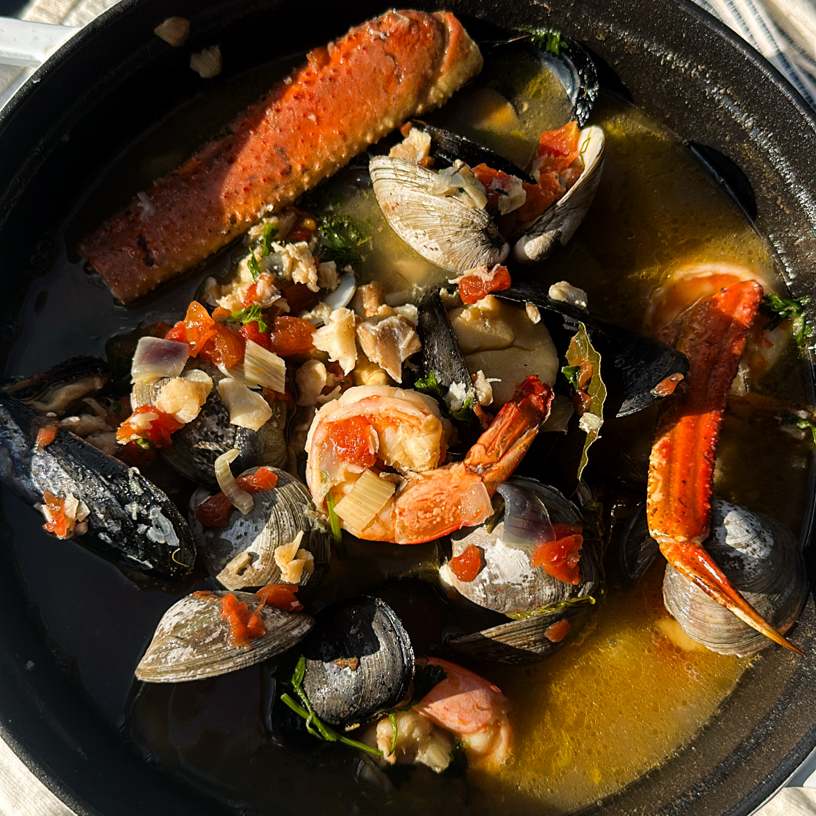 The Cioppino Kit includes a carefully selected assortment of premium seafood: 15 fresh mussels, one pound of Cedar Key middleneck clams, two-thirds of a pound of colossal shrimp, and a 12-ounce cluster of snow crab legs, and two portions of wild atlantic Cod.. This combination provides a rich variety of flavors and textures, ideal for creating an authentic, hearty seafood stew.