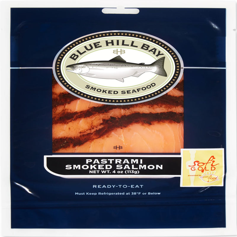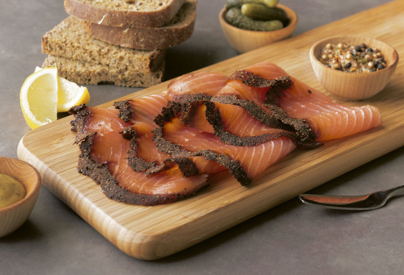 Cold-smoked using salt, herbs, and spices, Atlantic salmon filets are then thinly sliced and packaged. Salmon is topped with a hand-applied spice mixture creating a unique, delicious pastrami flavor. A great hors d'oeuvre or side for holidays or anytime!